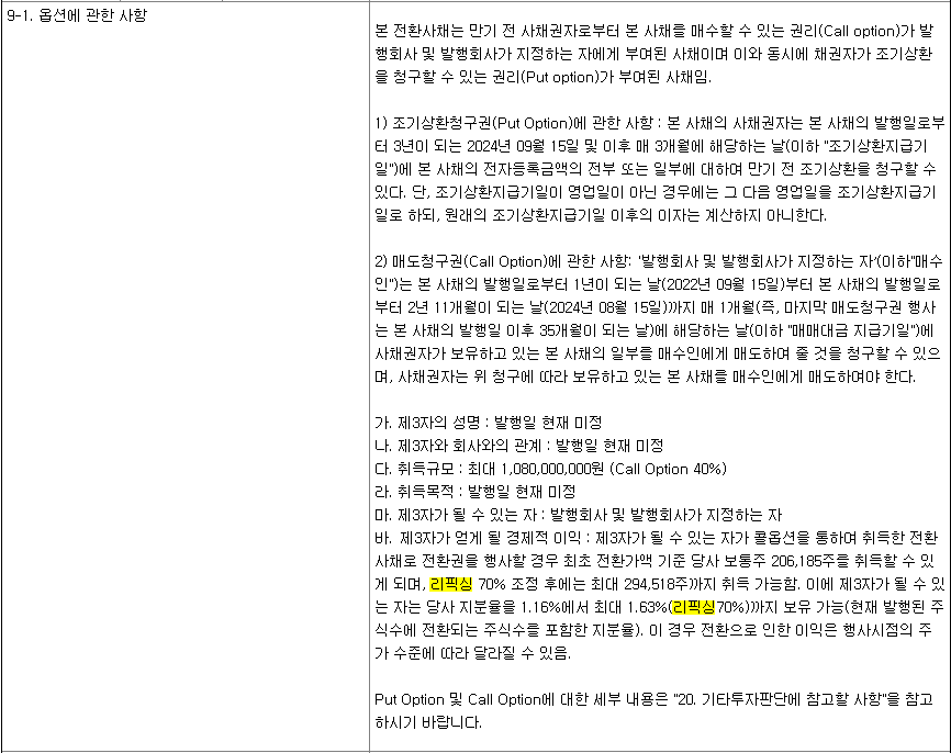 그리고 해당 9-1 항목에는 리픽싱과는 별개로 조기상환청구권(PUT OPTION)과 매도청구권(CALL OPTION)에 대해서도 자세히 기술되어 있습니다.