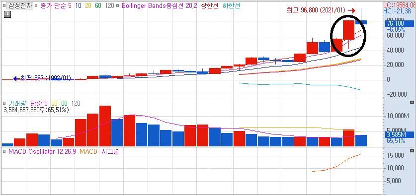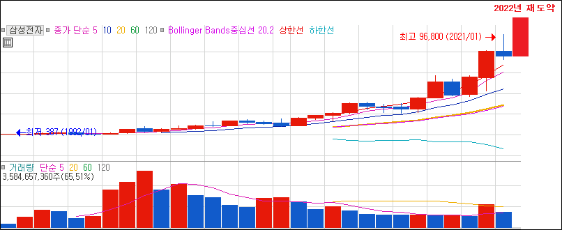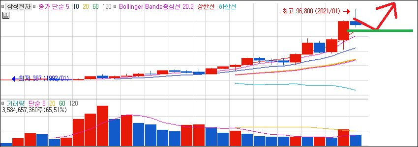 # 마지막으로 유튜브 등을 통해 삼성전자를 사서 존버하라는 소위 전문가들의 말만을 믿어서는 결코 성공할 수는 없음을 아셨으면 좋겠습니다. 과거 사례만을 두고 본다면 삼성전자는 추가적으로 상승할 수 없는 구간에 있으며, 다시금 60월선에 인접하거나 하회하는 차트를 만든 이후에라야 다시금 재도약을 준비할 수 있겠습니다.