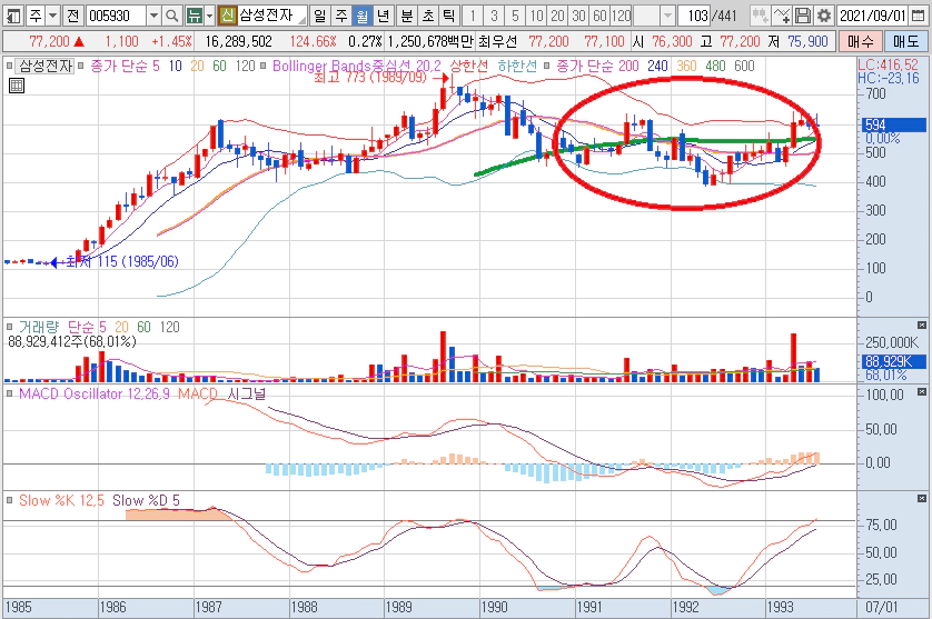 1985년~93년 기간 중 60월선(진한 초록색선)을 하회하였던 1991~1993년 기간이 제가 설명드리는 매수포인트 입니다.