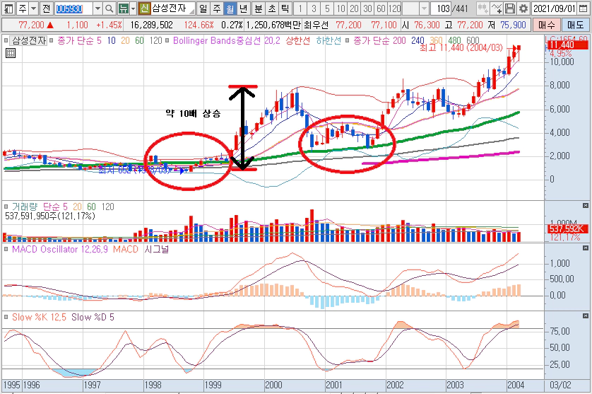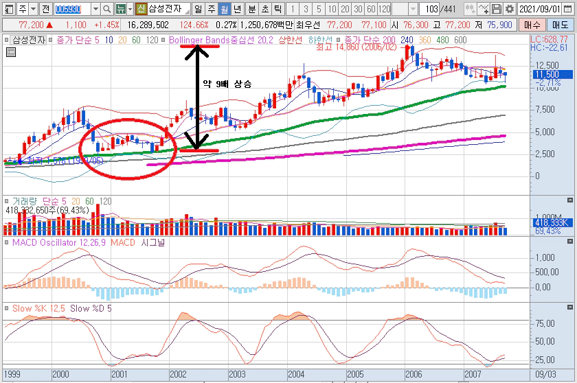 IMF시기 60월선을 하회하였을 때, 삼성전자를 매수하였다면, 2000년 대상승 시기에 2~3년만에 약 10배의 수익을 볼 수 있었습니다. 그리고 2000~2001년에 다시 매수포인트 구간인 60월선에 인접합니다. 해당 시기는 60월선을 하회하지는 않았으나, 앞서 대상승이 있었기 때문에 대상승구간에서 만일 매도하였다면 다시 접근해볼 수 있는 구간입니다.