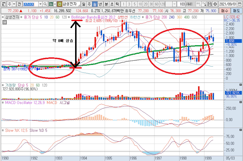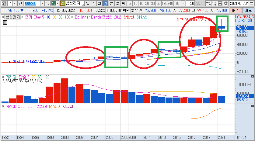 # 그리고 삼성전자의 상승주기는 평균 5년(IMF이후 시기 제외)이며, 하락주기는 평균 3년으로 삼성전자의 차트는 과거부터 현재까지 이어져온 반도체의 사이클을 그대로 따라가고 있음을 인지하셔야 하고, 2015년~16년 하락 사이클 이후 2016~2021까지 이어지는 5년간의 상승 사이클까지 모든 사이클을 마쳤음을 알고 투자에 임하셔야 합니다.
