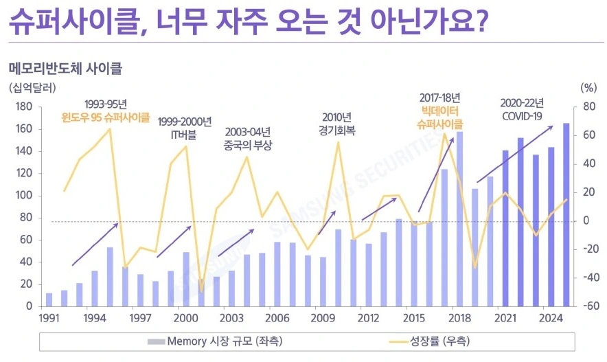 삼성전자 주가의 이러한 패턴은 반도체 사이클에 기인한 것으로 과거 20~30년간 반도체 사이클이 5년간의 호황 3년간의 불황을 반복해 왔음을 알 수 있습니다.