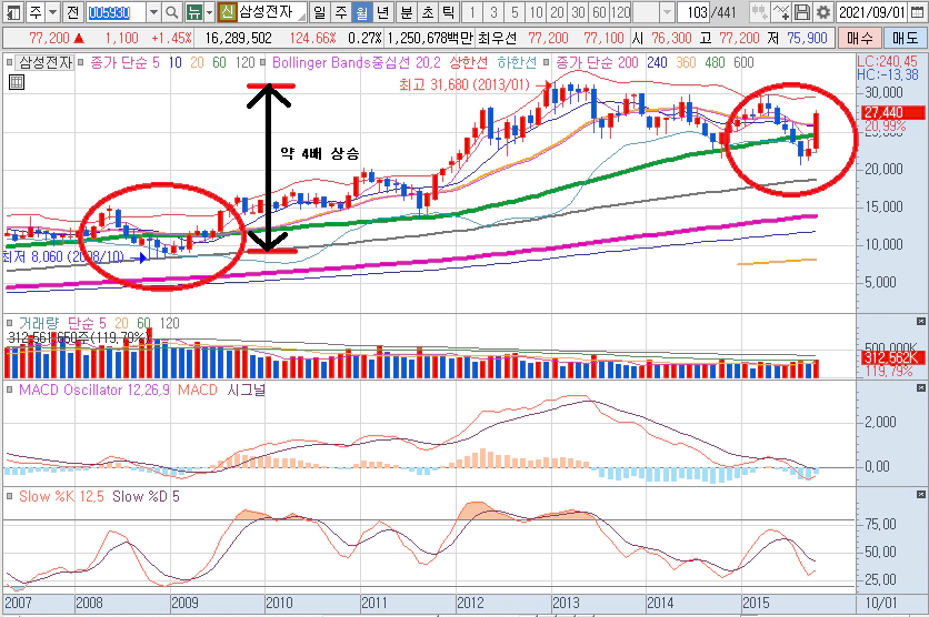 장기간 상승해온 삼성전자의 주가는 일정한 패턴을 나타내고 있고, 이 패턴은 바로 약 4~5년간 상승한 이후 3년에 이르는 조정기간을 거친다는 겁니다.