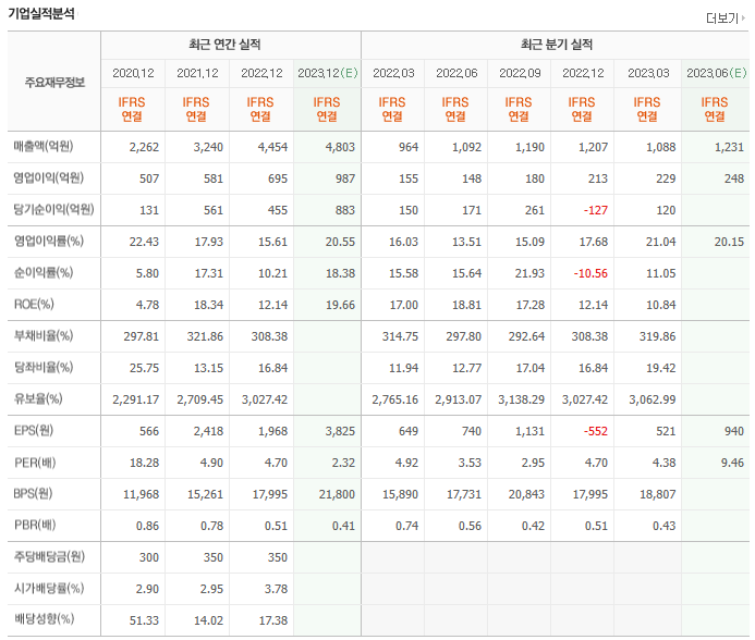시총은 2,131억이고 PBR 0.49배, PER 5.02배이고, 코스피 596위에 랭크되어 있습니다.