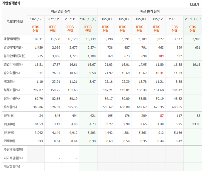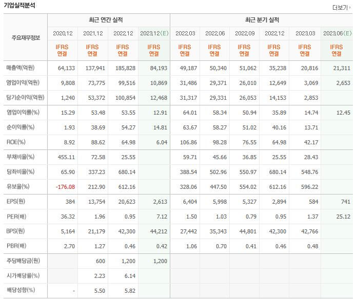 시총은 9조3,504억이고 PBR 0.45배, PER 1.29배(추정 7.32배)이고, 코스피 37위에 랭크되어 있습니다.